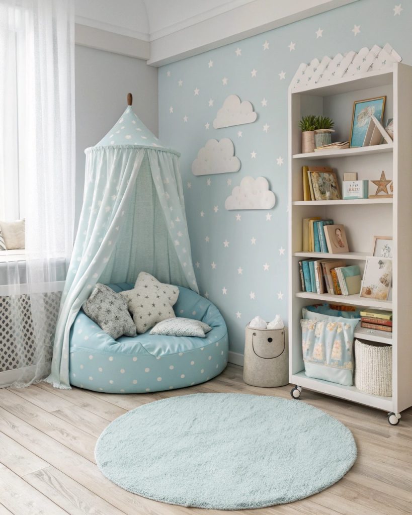 Utilisez un tapis douillet aux tons pastel pour imiter un ciel serein. Incluez une étagère remplie de vos histoires préférées, créant un endroit parfait pour des moments de complicité et de détente avec votre enfant.