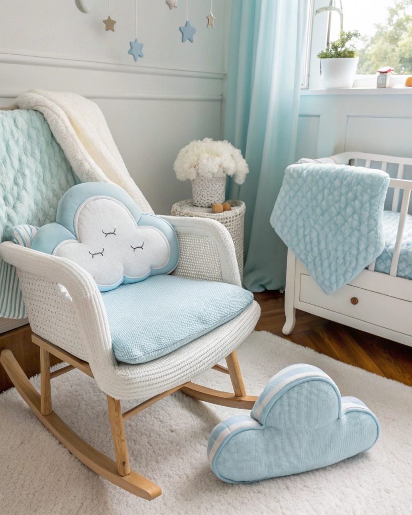 Choisir une palette de couleurs bleu doux et blanc pour la chambre de votre bébé apporte instantanément une sensation de calme et d’ouverture, comme si l’on entrait dans un ciel clair et ensoleillé.