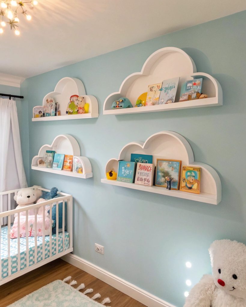 Lorsque vous concevez une chambre d’enfant, le rangement n’a pas besoin d’être ennuyeux—les étagères en forme de nuage combinent fonctionnalité et amusement.
