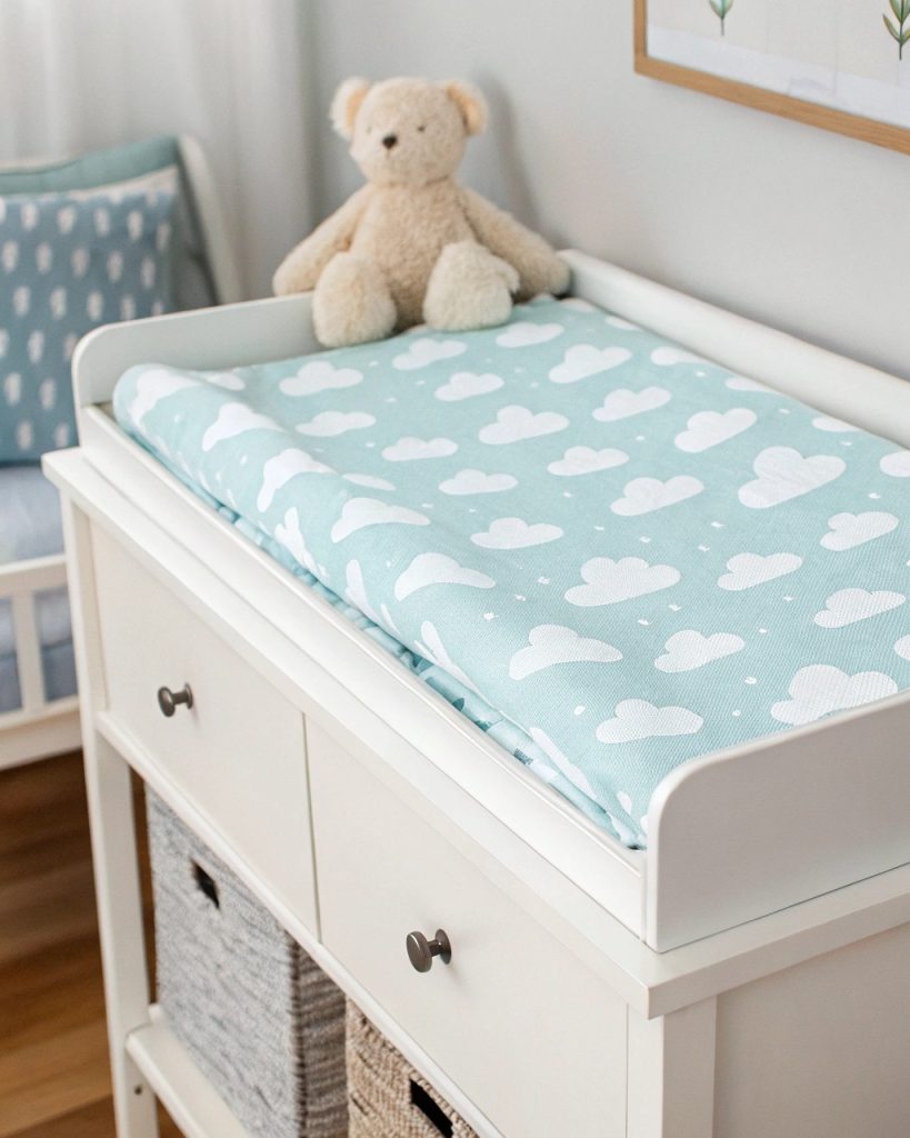 Un housse de table à langer nuageuse donne vie à l’esthétique onirique de la chambre de bébé tout en restant pratique.