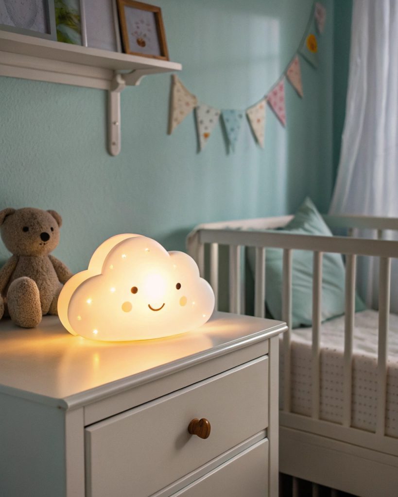 Une veilleuse en forme de nuage ajoute une lumière douce et apaisante, parfaite pour les changements de couches ou les biberons nocturnes. C’est à la fois rêveur, fonctionnel, et cela maintient une ambiance calme quand votre bébé en a le plus besoin.