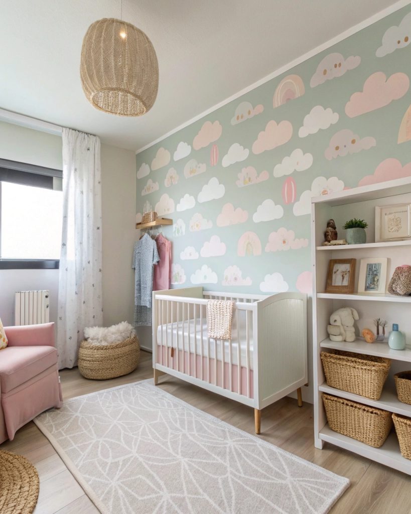 Recouvrez un mur d’accent avec des nuages doux et subtils pour créer un environnement apaisant pour votre tout-petit. Cette déclaration audacieuse mais sereine transforme la pièce en un havre de paix, parfait pour les siestes et les moments de jeu.