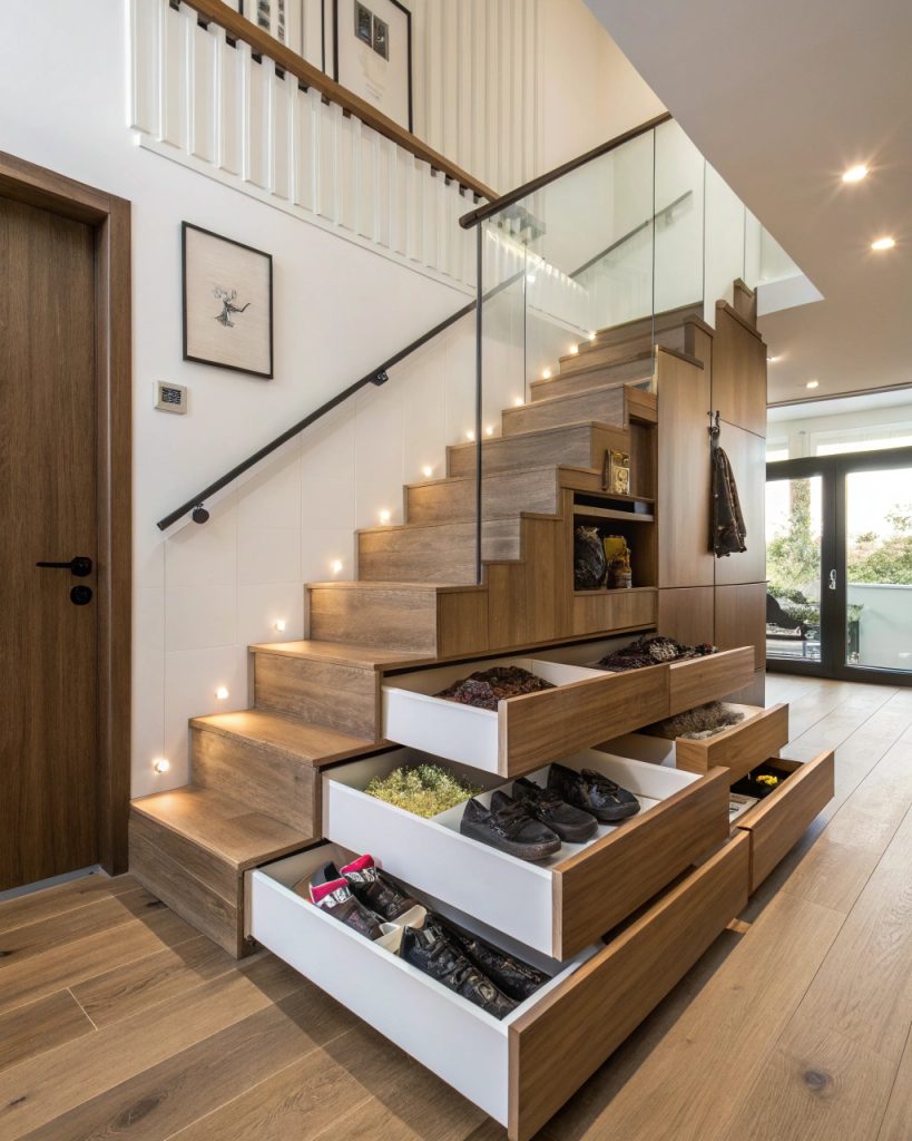 Un escalier n’est pas seulement un moyen d’accéder à l’étage ; il peut être un trésor caché pour le rangement ! Vous pouvez transformer les marches en tiroirs pour des chaussures, des outils ou des livres, rendant votre maison plus organisée.
