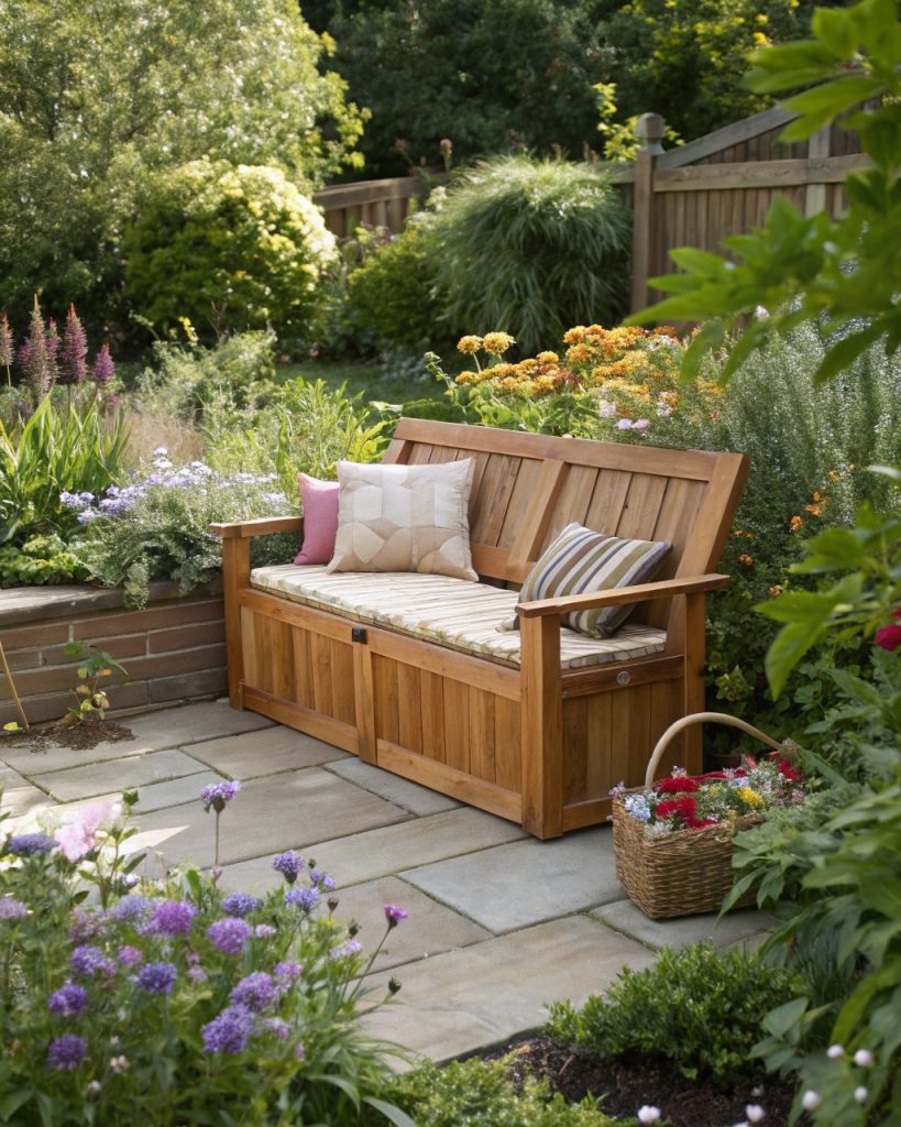 Pensez à utiliser des bancs de jardin avec des compartiments cachés pour ranger des outils ou des coussins. Vous pouvez également installer des coffres de rangement ou cacher du rangement sous des escaliers extérieurs. Les terrasses en contrebas utilisent souvent des solutions de rangement cachées pour maintenir une vue dégagée et élégante sur le jardin.