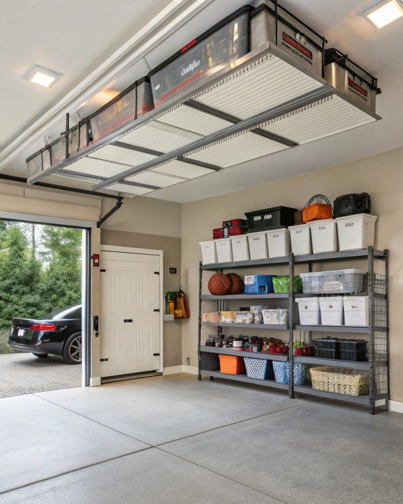 Le stockage au plafond tire parti de cet espace souvent négligé au-dessus de nos têtes, ce qui en fait une solution astucieuse pour garder votre maison organisée. C’est parfait pour les garages, les greniers ou même ces appartements exigus. Des armoires encastrées peuvent être intégrées dans les conceptions de stockage au plafond pour une solution harmonieuse et efficace.