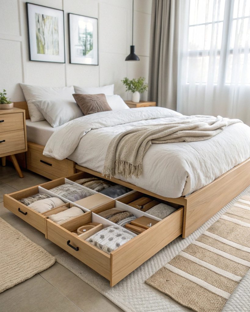 Des boîtes de rangement plates ou des tiroirs coulissants peuvent contenir des vêtements de saison, des couvertures supplémentaires ou des livres.