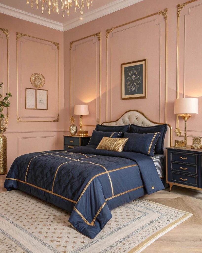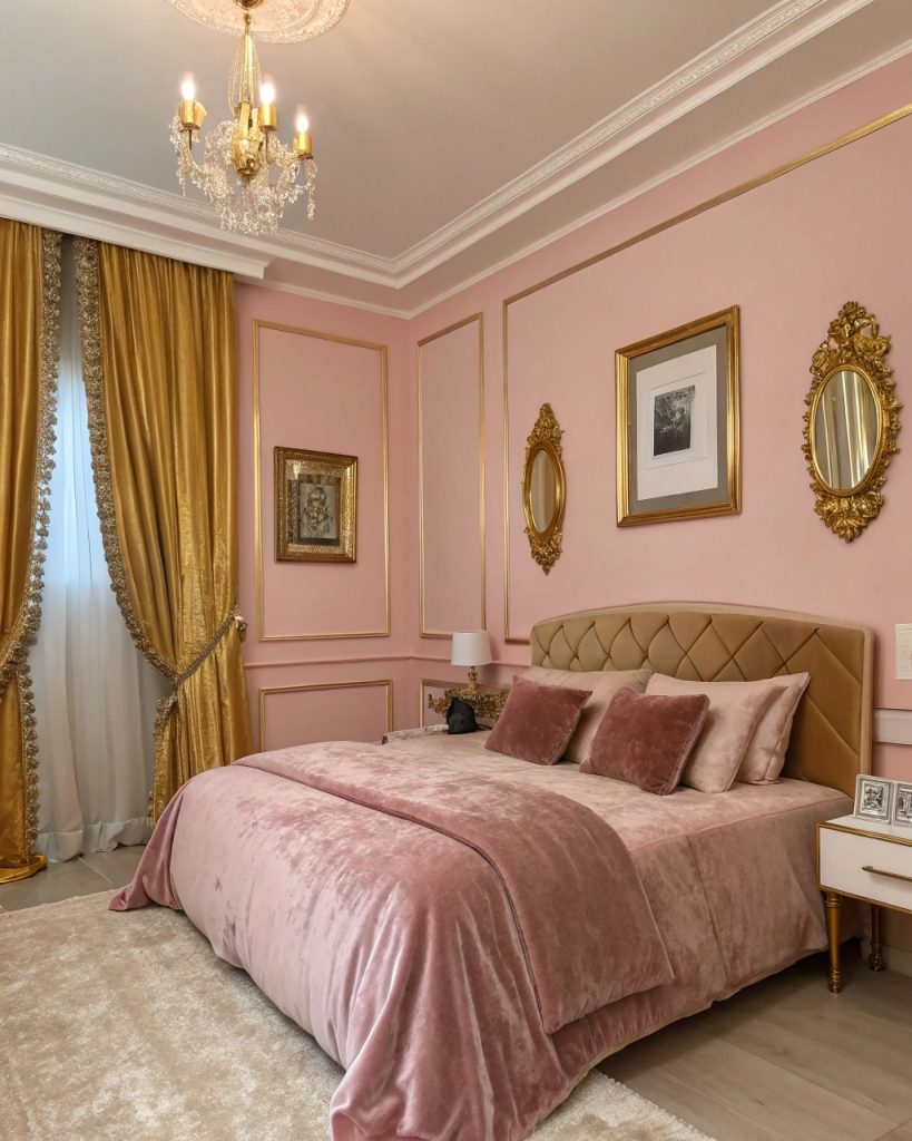 1. Peignez vos murs d’un rose doux et ajoutez des accents or pour une ambiance luxueuse.