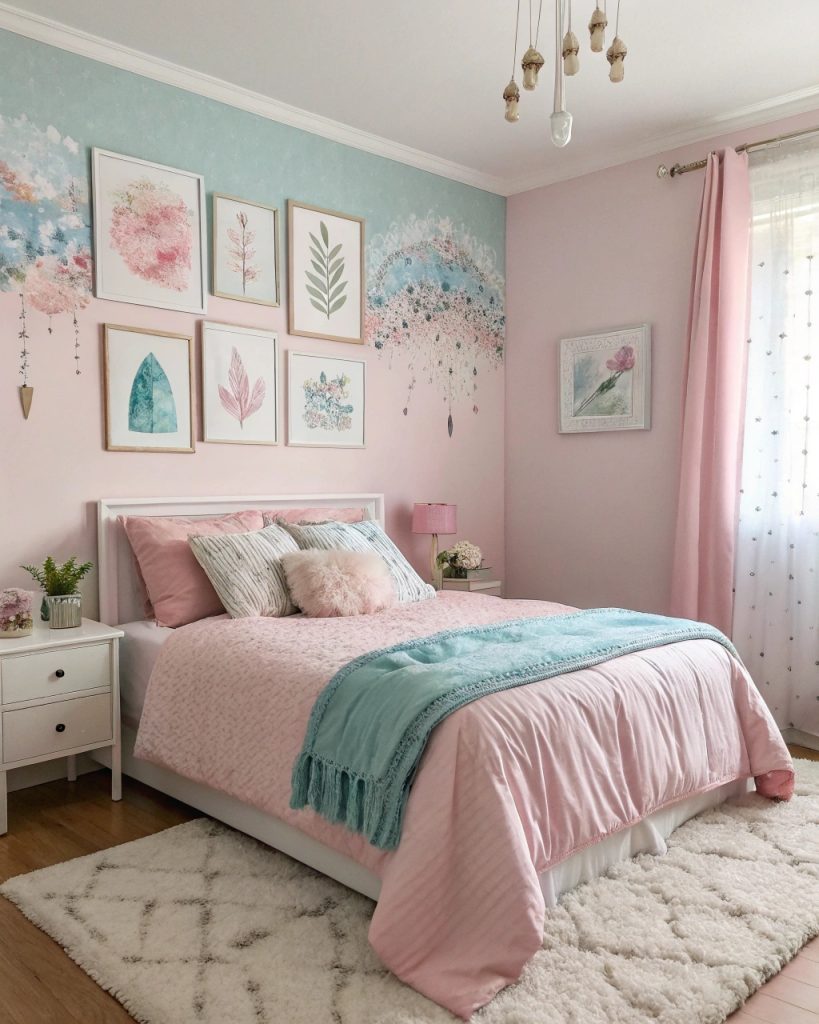 Lorsque vous mélangez des murs rose pastel avec des touches de bleu clair, vous créez un espace à la fois doux et accueillant, presque comme un nuage dans lequel vous pouvez vous blottir.