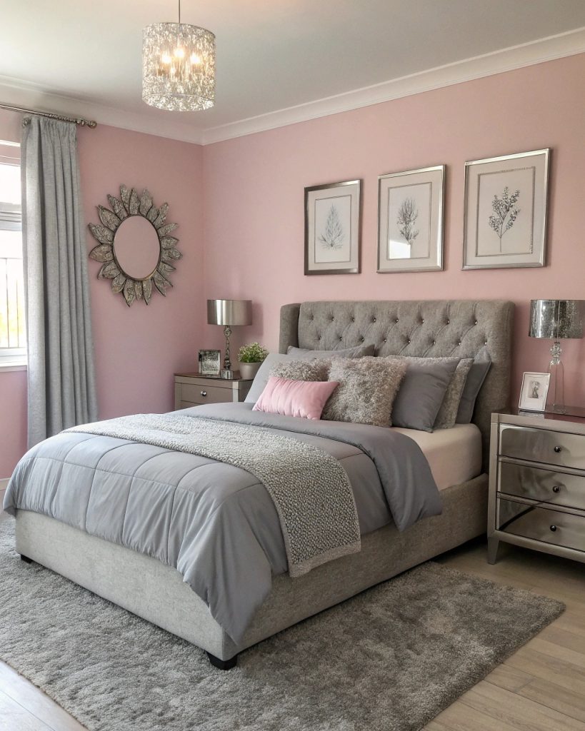 Mélanger le rose et le gris dans votre chambre crée une ambiance élégante à la fois fraîche et accueillante.