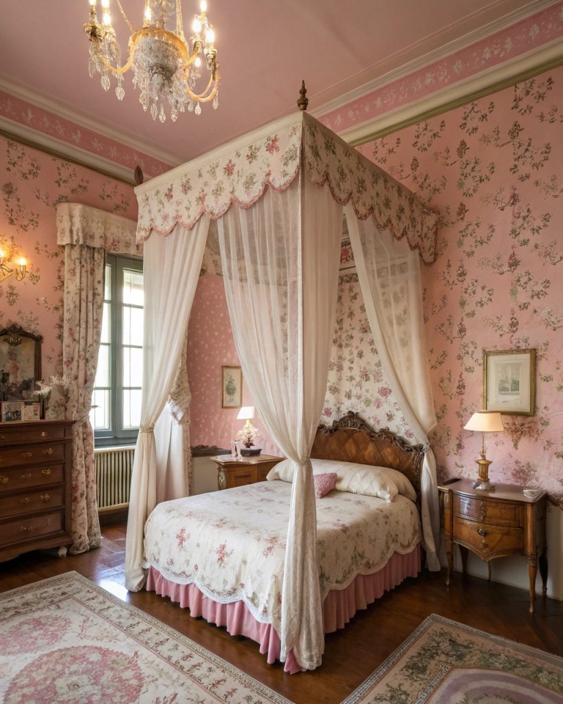 Un papier peint ou une literie à motifs floraux peut créer une ambiance ravissante, tandis que du mobilier d’inspiration vintage comme du bois blanchi ou des cadres dorés brillants ajoute une touche d’élégance.