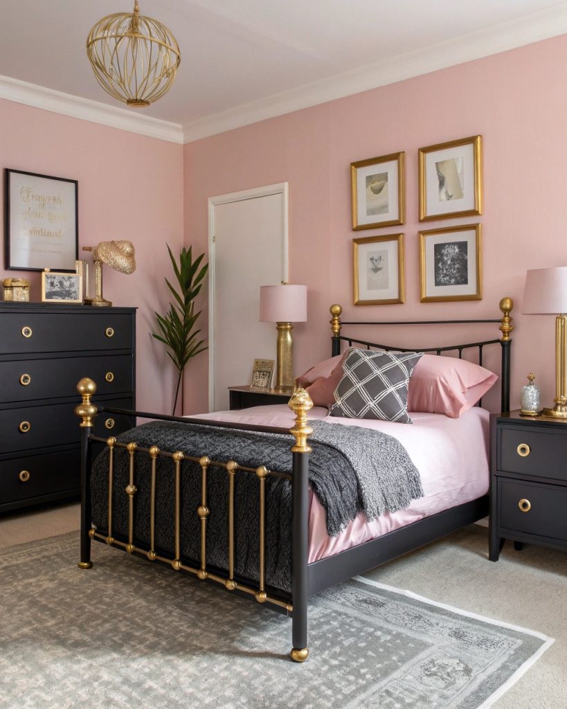 1. Des murs rose doux contrastant avec des meubles noirs élégants.