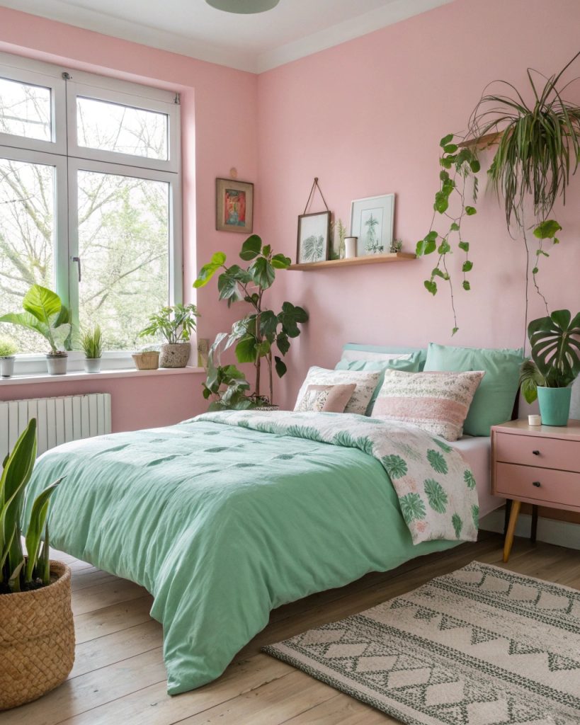 Si vous rêvez d’une chambre qui ressemble à un havre de paix régénérant, associer des murs rose pâle à des accents vert menthe est la solution idéale. Imaginez ceci :