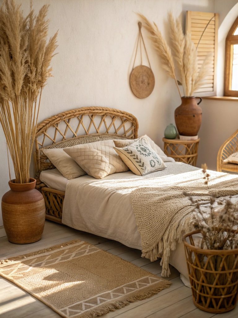 Superposez un tapis de jute ou ajoutez des paniers en rotin pour une touche de chaleur et de charme. Remplacez votre literie par du lin ou du coton respirant pour maintenir une ambiance détendue.